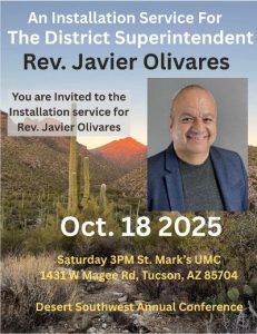 You are invited to the installation service for Rev. Javier Olivares on Saturday, October 17th at 3:00 p.m.  The service will take place at St. Mark’s UMC – 1431 W Magee Rd, Tucson, AZ 85704.  Please join us!