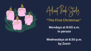 We will meet on Mondays at 9 am in Classroom 15 and Wednesdays by Zoom at 6:30 pm for one hour beginning Nov 17th/19th. (skipping Thanksgiving week). We will explore the 2 separate Birth narratives of Matthew and Luke and their implications as preludes for each of the Gospels. These two narratives point to the context for the expectations we are focused on in this season, Maranatha, Come Lord, Come! Rev Ed
